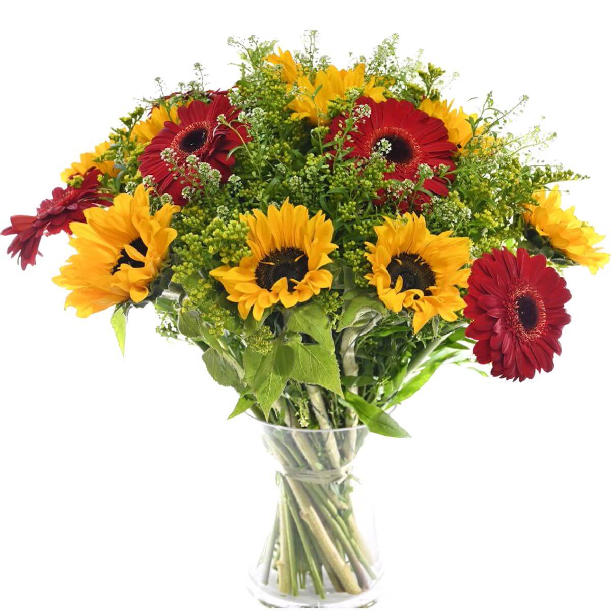 זר צהוב-אדום-ירוק שמשלב חמניות צהובות יפיפיות עם גרברות אדומות פורחות, בשילוב ענפי קישוט מיוחדים.