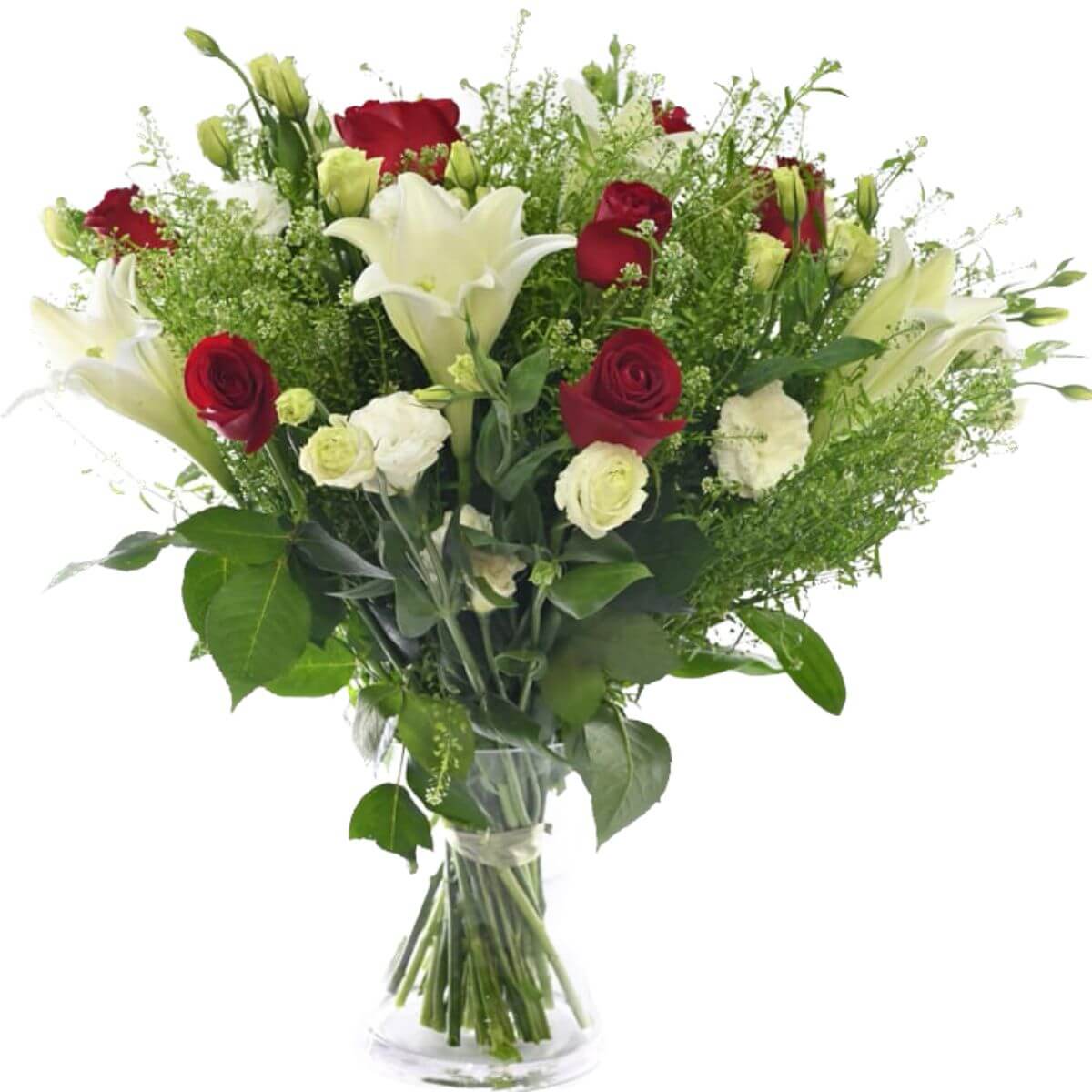 זר עשיר ומגוון השזור מוורדים אדומים, שושן צחור וליזיאנטוס לבן בשילוב ענפי קישוט מיוחדים. זהו זר אסתטי ומושך שמחבר צורות פריחה שונות ומסמל נצחיות ותעוזה.