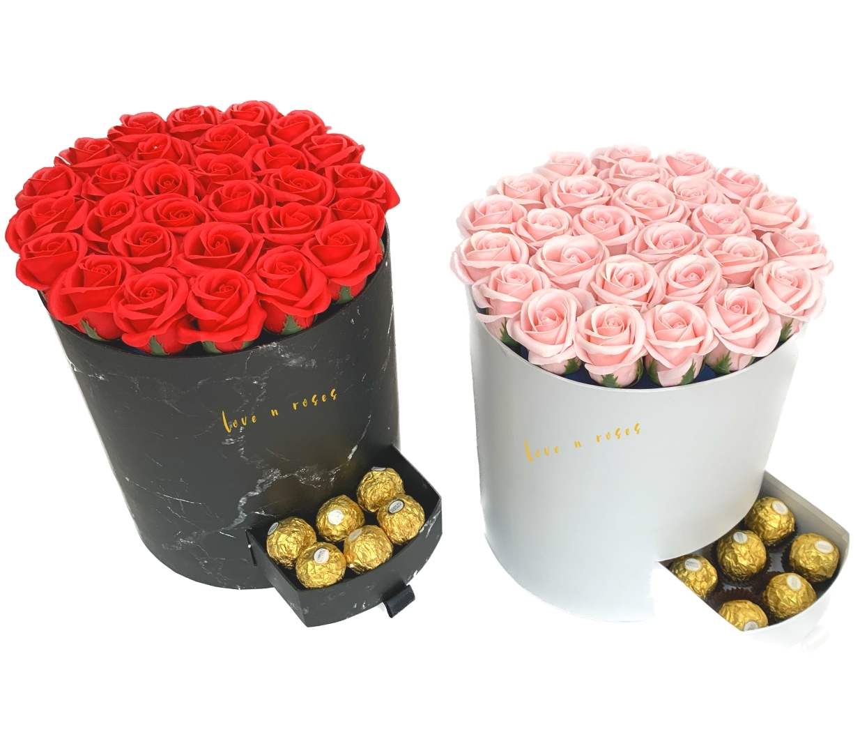 מארז מעלף מורדי סבון ריחניים - בקופסה מיוחדת עם מגירה קטנה מלאה בשוקולד ופררו רושה